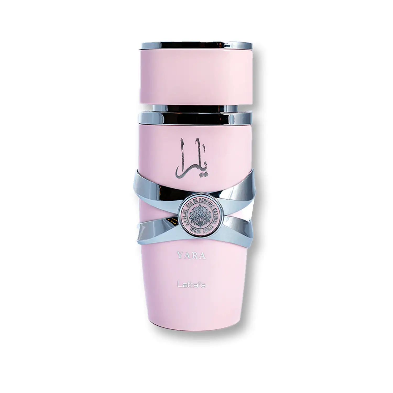 بطری ادکلن لطافه یارا طراحی مدرن و زنانه دارد. شیشه استوانهای با رنگ صورتی و درپوش صورتی و نقرهای، ظاهری لوکس و شیک به این عطر بخشیده است. لوگوی برند روی شیشه، جلوهای ساده اما جذاب ایجاد میکند و حس لطافت و زنانه بودن را تقویت میکند.